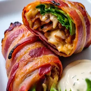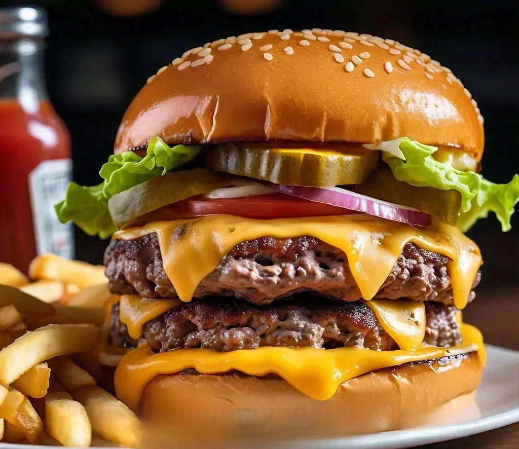 A savory cheddar-style hamburger filled with melted cheese and mayonnaise, complemented by smoky bacon.