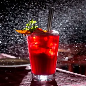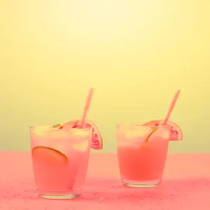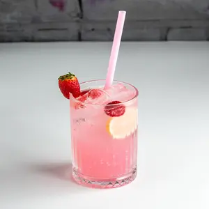 Refreshing pink lemonade with a sweet-tart flavor, served ice-cold and fizzy.